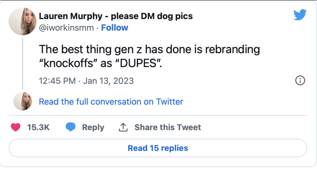 What’s even more interesting is how the meaning of the word “dupe” has evolved in the age of TikTok. Once a term reserved for near-identical knockoffs, it has now come to represent anything that remotely resembles its luxurious counterpart. And in a delightful twist of irony, influencers are now creating “dupe” content by mimicking each other’s videos.